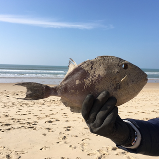 Niveau "photos insolites" : on a été servis ! On a pu trouver des brosses à dents, une pièce italienne de 1998, de la ferraille enterrée qui venait probablement d'un blockaus enfoui, des os (probablement d'oiseaux), des balles de fusils (...), une ampoule... mais aussi : - une porte de frigo (bon j'ai un peu triché...repérée samedi dernier et gentiment ramassée par quelqu'un d'autre dans la semaine ;-) ) - une daurade entière à qui il manquait seulement les yeux... - une squelette de dauphin malheureusement pris dans un filet….